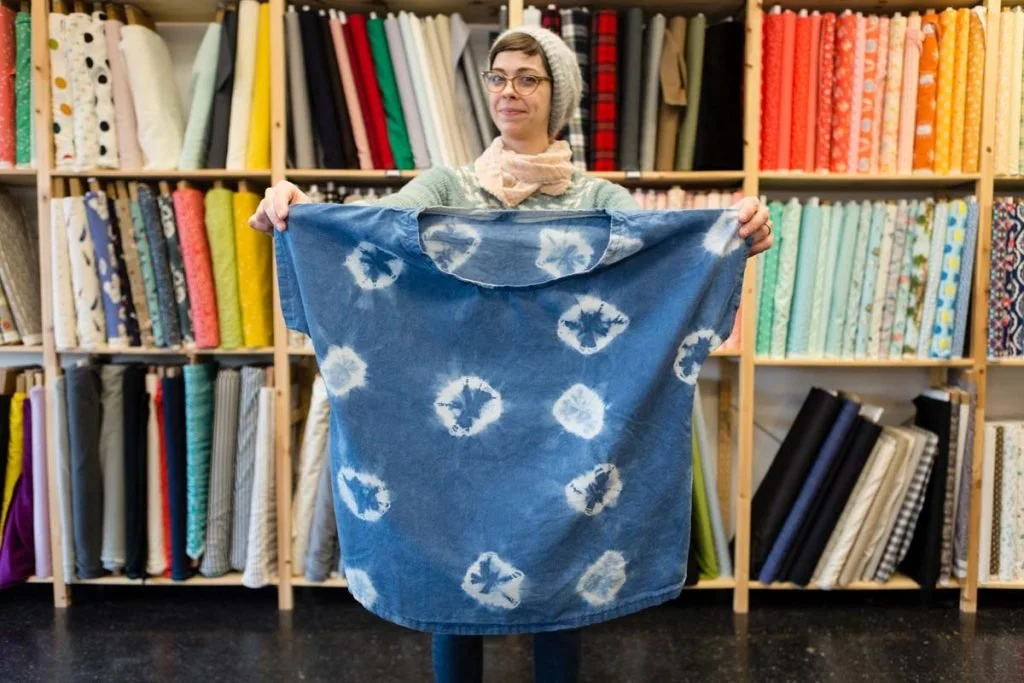 Freeman-Lynde shows a sample shirt from a workshop, hand sewn and dyed with indigo using a shibori technique.